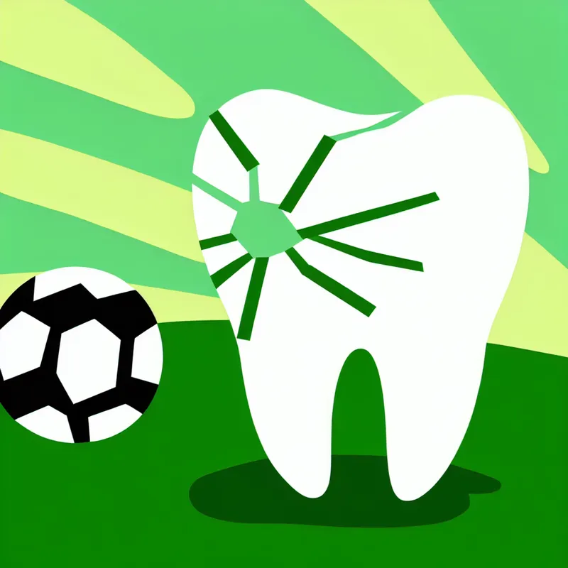 Minimalistische illustratie van een grote gebroken witte tand met een scheur, liggend op felgroen gras naast een voetbal