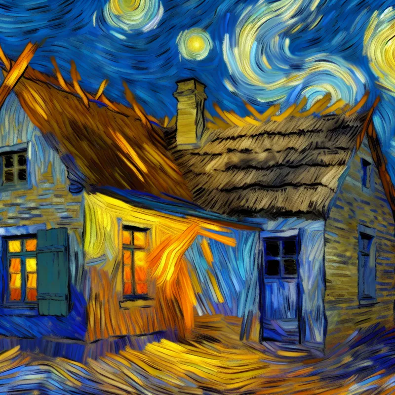Kleurrijk Van Gogh-achtig schilderij van een oud huis met een open raam dat het concept 'waarin' in een bijzin illustreert