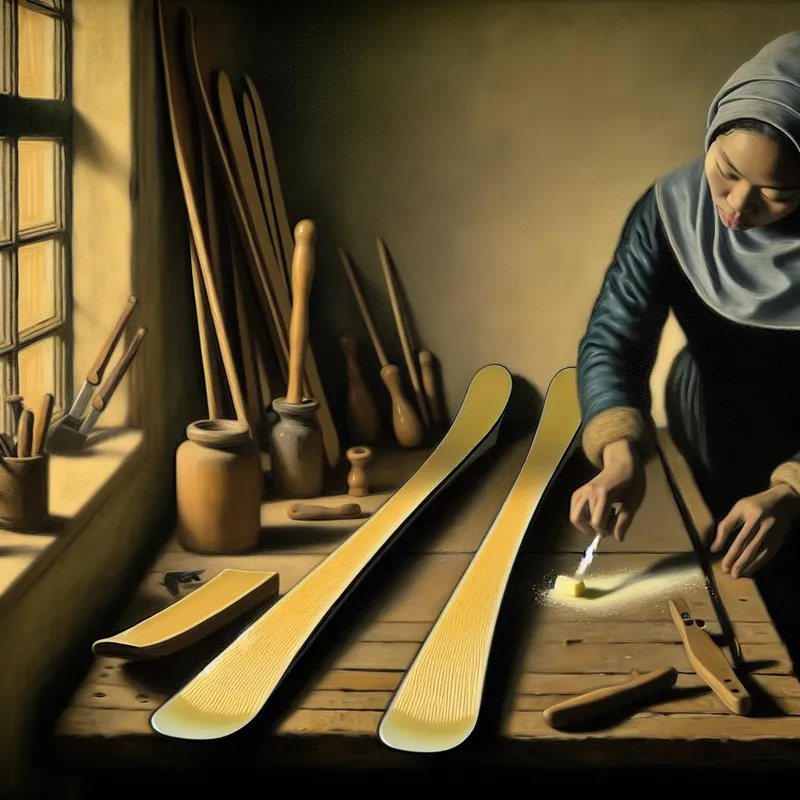 Persoon brengt zorgvuldig een laag was aan op een paar ski's in een rustige, verlichte werkruimte in de stijl van Vermeer