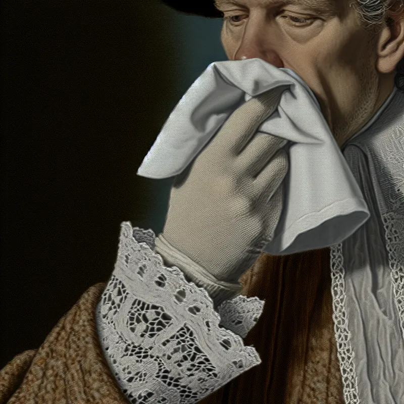 17e-eeuwse Nederlandse genretafereel van een elegante man die zijn neus snuit met een witte linnen zakdoek, stijl van Gerard ter Borch
