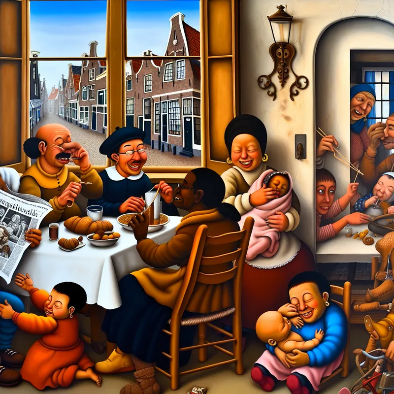 Gezellige Nederlandse familie die op een traditionele rustdag samen geniet van een zondagse maaltijd in een warme huiskamer, in de stijl van Jan Steen
