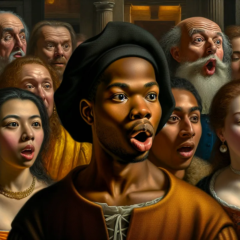 Groep mensen in een grote zaal met verbaasde gezichten, één persoon maakt een zachte 'ah'-uitroep van verwondering in de stijl van Frans Hals