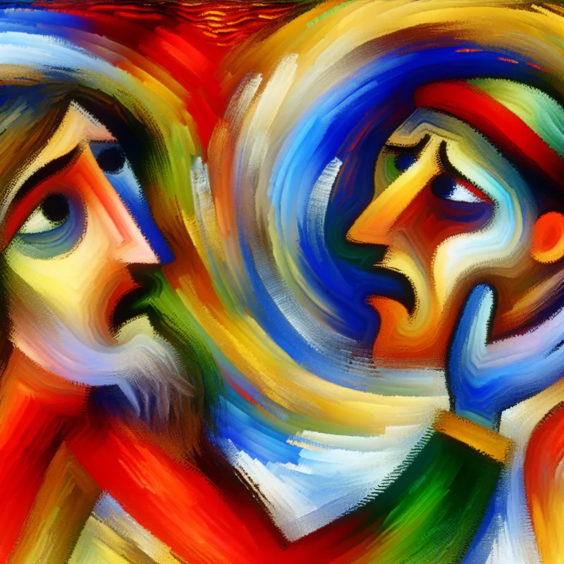 Abstract schilderij van twee figuren die medeleven tonen, met expressieve gezichten en levendige kleuren in de stijl van Karel Appel
