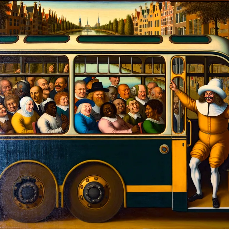 Vrolijke buschauffeur begroet passagiers vanuit een klassieke stadsbus in een levendige Nederlandse straat met markt en typische architectuur