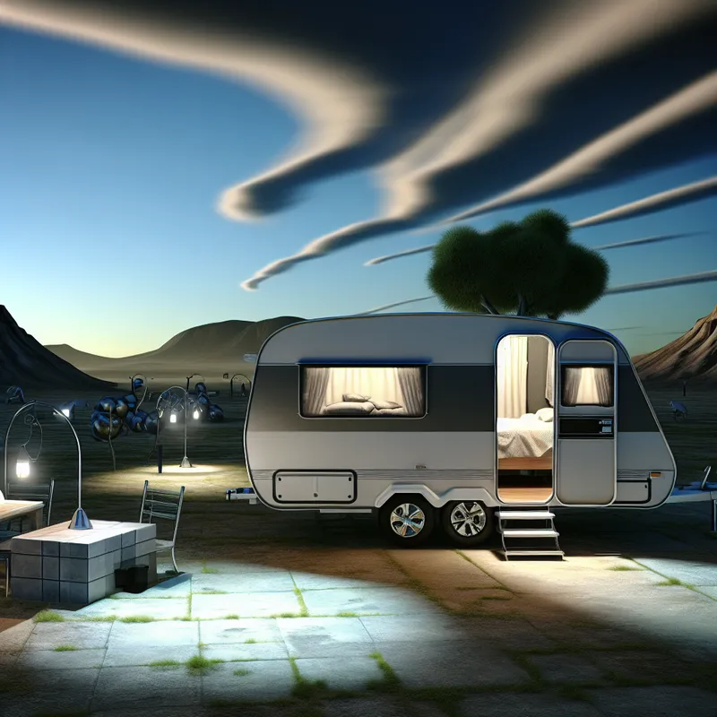 Hyperrealistische en surrealistische afbeelding van een gezinsvakantie met een caravan als tijdelijk thuis, geparkeerd op een uitgestrekt, dromerig kampeerterrein onder een dramatische lucht