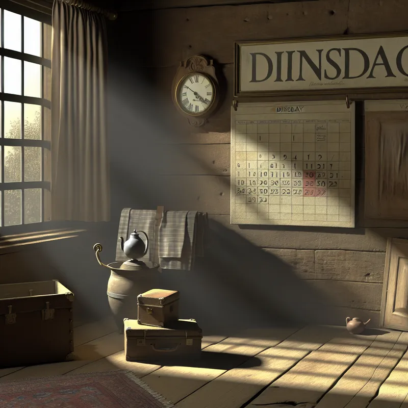 Stille dinsdagochtend met zonlicht, kalender met omcirkelde dinsdag, half ingepakte koffer en klok op 6:30 uur in Vermeer-stijl