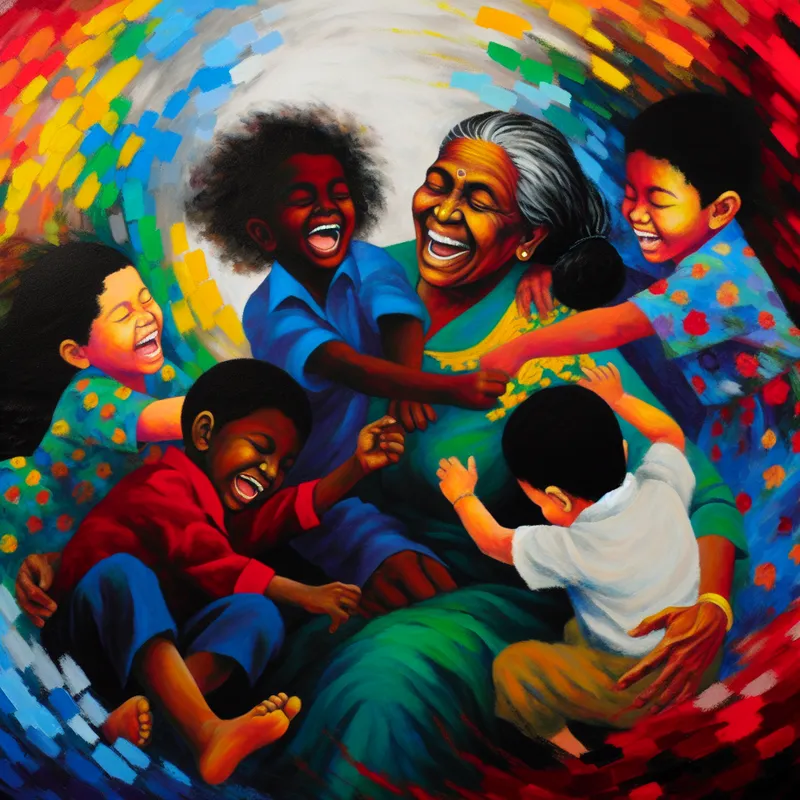 Abstract schilderij van een blije oma omringd door haar kleinkinderen, uitdrukking van pure liefde en vreugde in warme kleuren