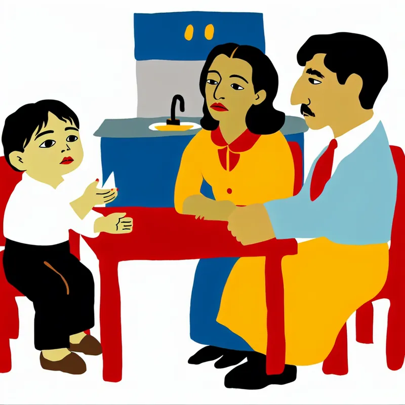 Minimalistische illustratie van een jongen die openhartig de waarheid vertelt aan zijn ouders aan de keukentafel, in de stijl van Dick Bruna