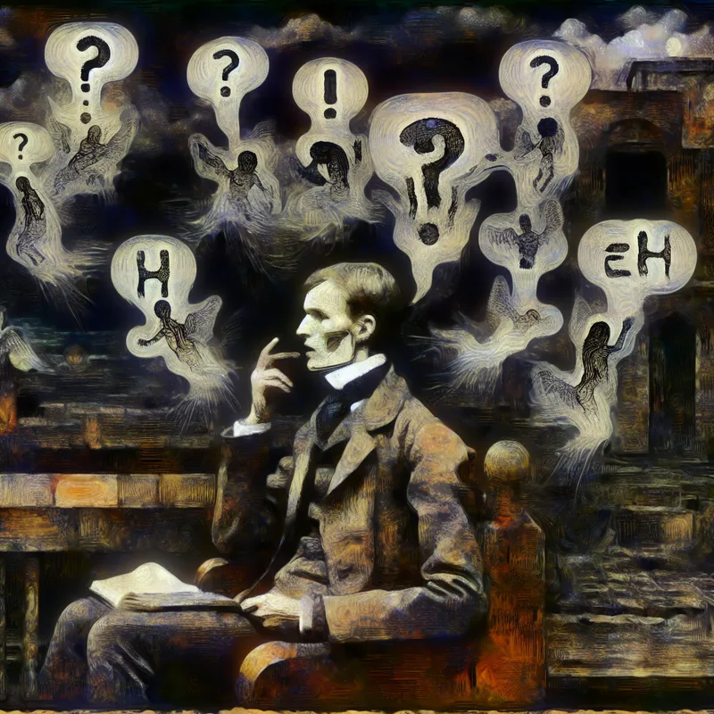 Artistieke weergave van aarzeling tijdens spreken met zwevende spraakballonnen en fragmenten zoals 'eh' en vraagtekens in een donkere, mysterieuze sfeer