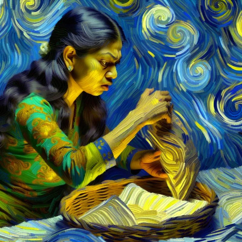 Vrouw in Van Gogh-stijl observeert een mysterieus voorwerp met intense aandacht en nieuwsgierigheid