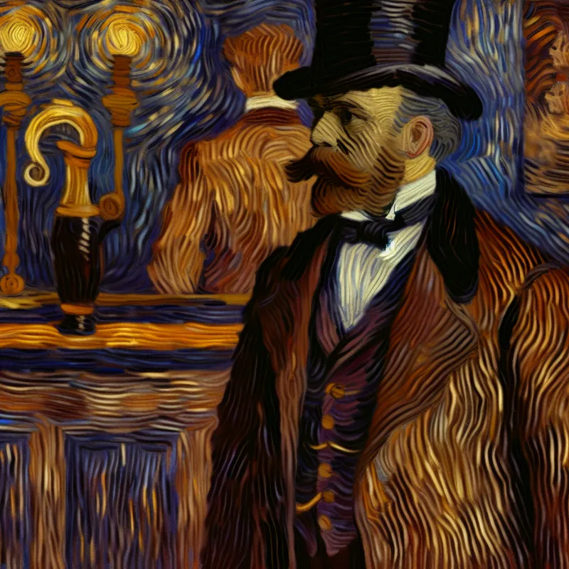 Gentleman in formeel pak met hoge hoed in stijl van Van Gogh, illustratie van het woord 'heer' in beleefde context