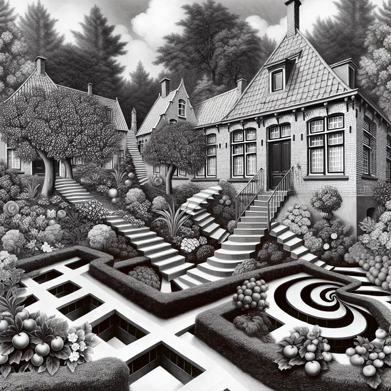 Surrealistisch tuinontwerp in de stijl van M.C. Escher met een Belgische stadstuin, fruitbomen, bloemen en optische illusies