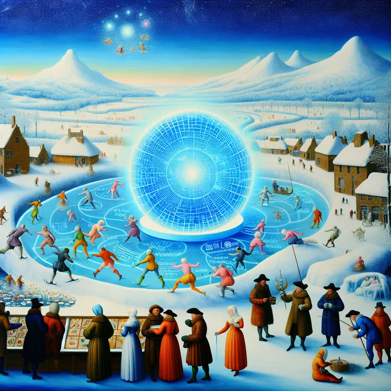 Levendige winterscène met futuristisch ijsbeeld van een gloeiende wereldbol, symboliserend het wereldwijde computernetwerk, met mensen die informatie zoeken op digitale tablets in een historische setting