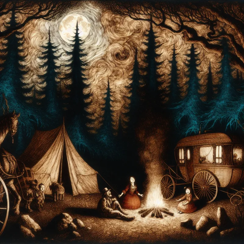 Gothische nachtscène van een familie die buiten overnacht bij een kampvuur in een bosrijke omgeving met tent, caravan en camper, maanverlicht en mysterieus