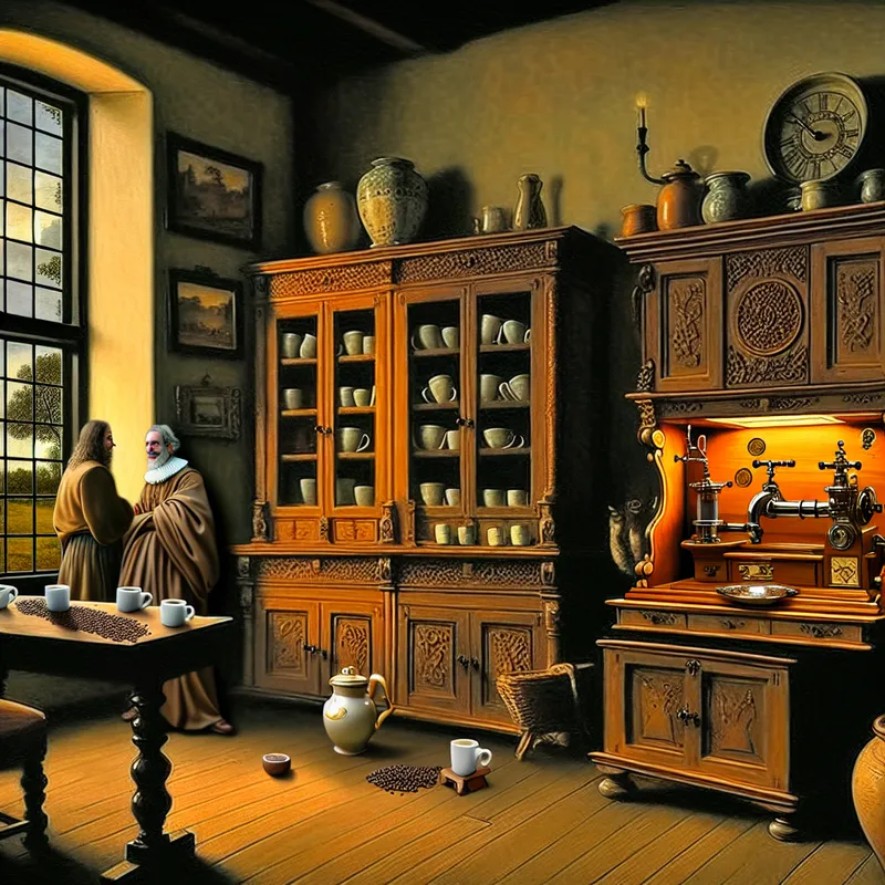 Gedetailleerde 17e-eeuwse Nederlandse kantoorinterieur met gezellige koffiehoek, geïnspireerd op Jacob van Ruisdael, met twee collega's in gesprek bij een espressomachine