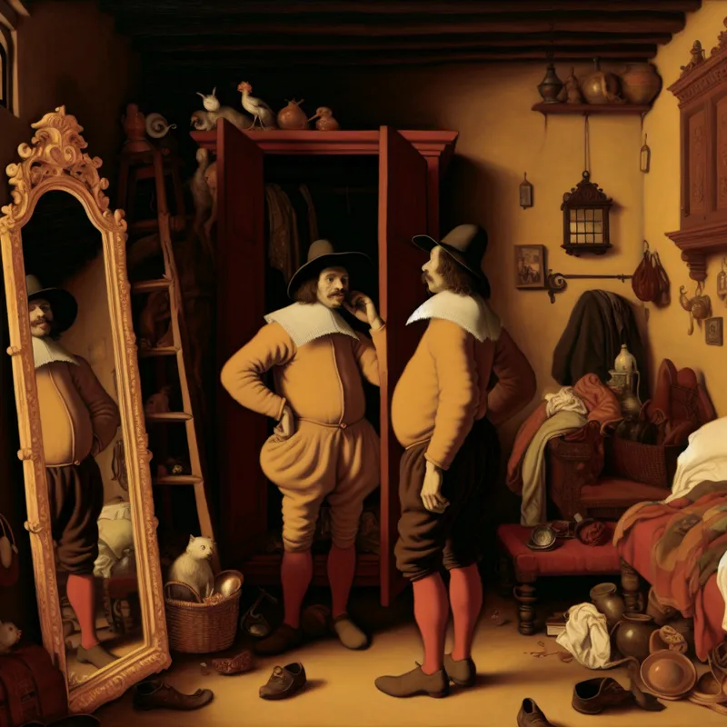 Gedetailleerde scène in de stijl van Jan Steen: persoon observeert zichzelf in een grote, sierlijke spiegel in een gezellige, rommelige kamer met warme kleuren en humoristische details