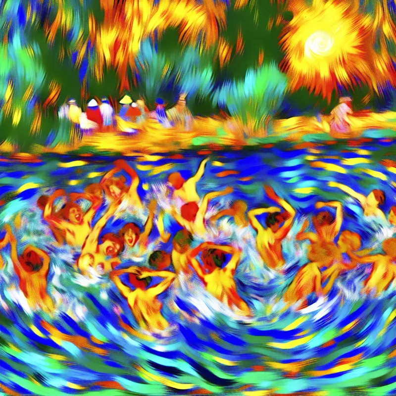 Abstract expressionistisch schilderij van naakte kinderen die vrolijk zwemmen in een helder meer, met dynamische penseelstreken en levendige kleuren