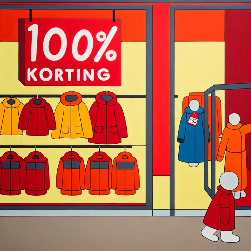 Minimalistische kledingwinkel met rode uitverkoopbord '10% KORTING' en winterjassen met kortingsprijzen, in stijl van Dick Bruna