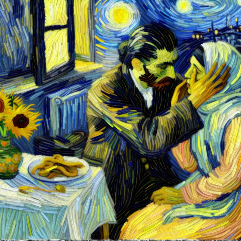 Intiem schilderij in Van Gogh-stijl van een stel in een gezellige kamer, waarbij de man teder 'Hoi schat' fluistert tegen zijn geliefde met zonsondergang en sterrenhemel op de achtergrond