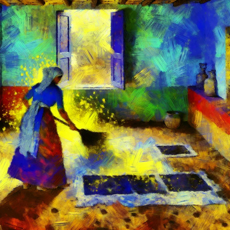 Persoon veegt met bezem de vloer in een levendig Van Gogh-stijl interieur, stofdeeltjes dansen in het zonlicht