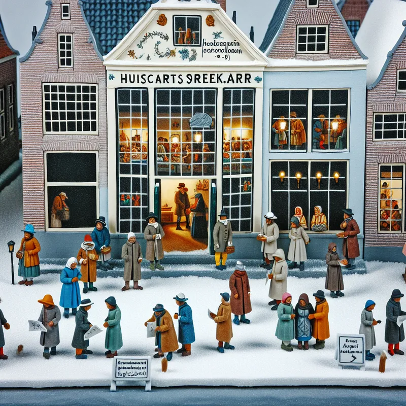 Drukbezochte Nederlandse stadstuin in winter met wachtende mensen voor een huisartsenpraktijk of decanaat tijdens spreekuur, in de stijl van Hendrick Avercamp