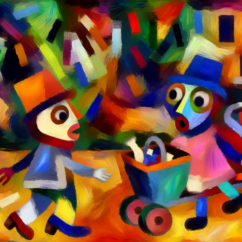 Twee vrolijke figuren met kinderlijke gezichten botsen onverwacht in een kleurrijke, chaotische straatscène in de expressieve stijl van Karel Appel