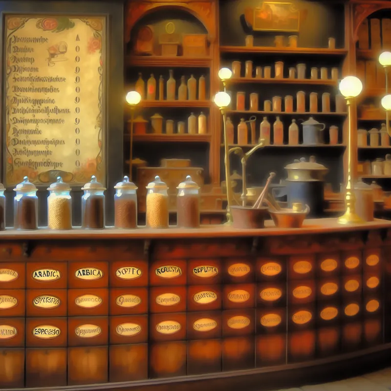 Charmant vintage koffiehuis met houten toonbank en gelabelde potten koffiebonen per categorie zoals Arabica, Robusta en Espresso