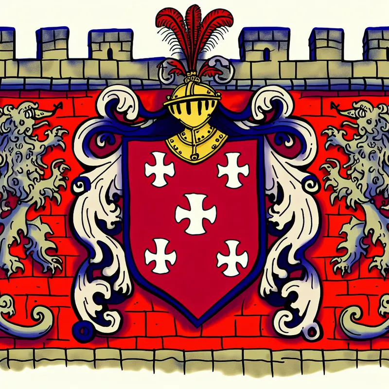 Kleurrijk middeleeuws familiewapen met drie witte kruisen op een rood schild, omringd door decoratieve elementen zoals een helm en mythologische dieren in cartoonstijl