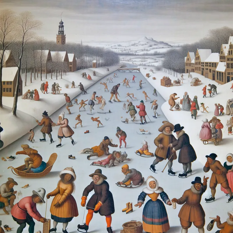 Drukke winterse ijsbaan met mensen die zich haasten voor een belangrijk moment, geschilderd in de stijl van Hendrick Avercamp
