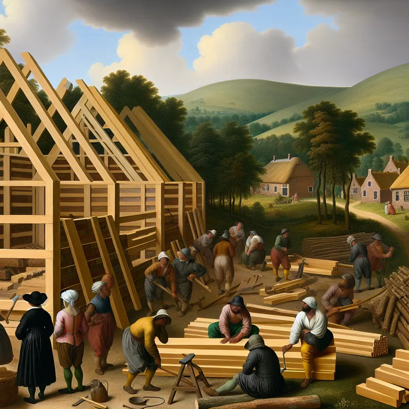 17e-eeuwse Nederlandse landschapsschildering van arbeiders die een houten schuur bouwen met gereedschap en houtstapels, in de stijl van Jacob van Ruisdael