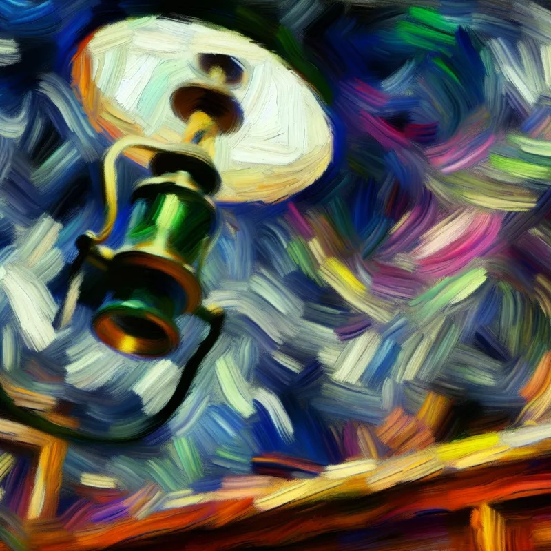 Abstract expressionistisch schilderij van een lamp die hoog boven een tafel hangt, met dynamische penseelstreken en levendige kleuren om het concept 'boven' uit te beelden