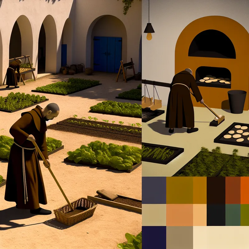 Monnik in traditionele habijt verzorgt geometrische moestuin in vredige kloostertuin met retro-futuristische stijl