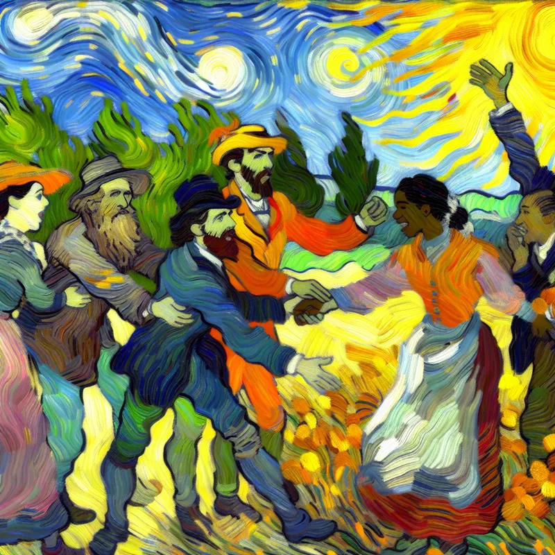 Vrolijke groep mensen werkt samen in Van Gogh-stijl met warme kleuren en zwierige penseelstreken, dankzij hulp en mooi weer