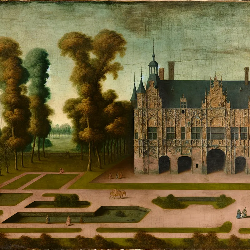 Elegant schilderij van een groot kasteel met een uitgestrekt park erachter, ter illustratie van de locatie 'achter' in het Nederlands