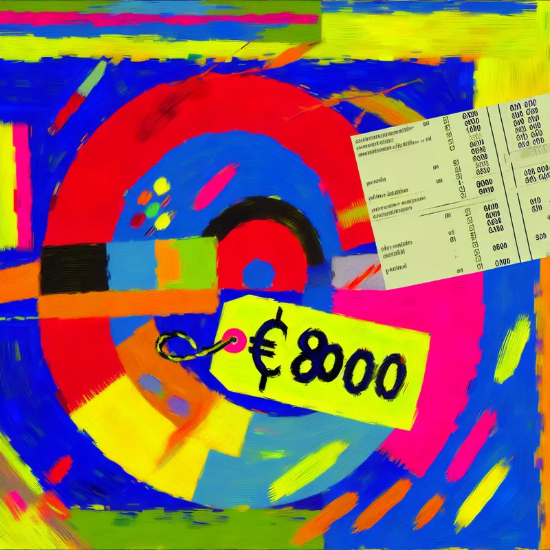 Abstracte voorstelling van een laptop met prijskaartje van 800 euro exclusief bijkomende kosten zoals BTW, in expressieve stijl van Karel Appel