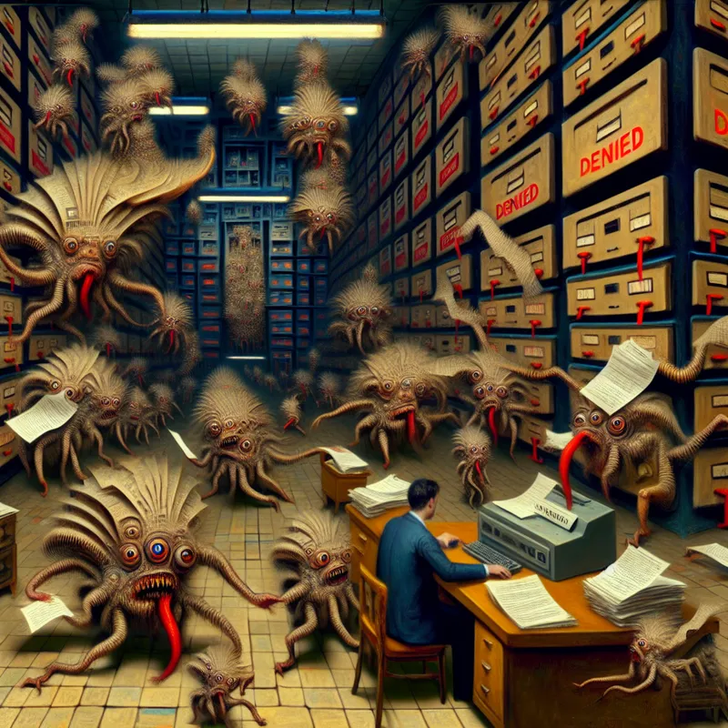 Surrealistische nachtmerrie van een bureaucratisch kantoor met hybride wezens en eindeloze papierwinkel, geïnspireerd op Hieronymus Bosch