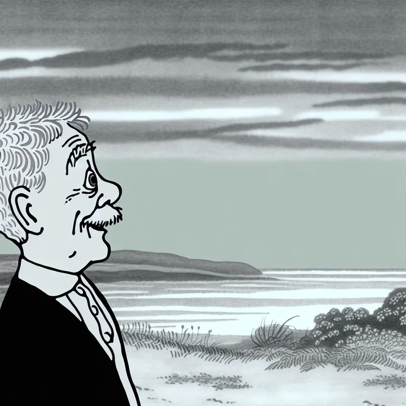 Cartoonachtige illustratie van een persoon met grijs haar die een serene grijze ochtendlucht bewondert, symboliserend de kleur grijs in natuur en uiterlijk