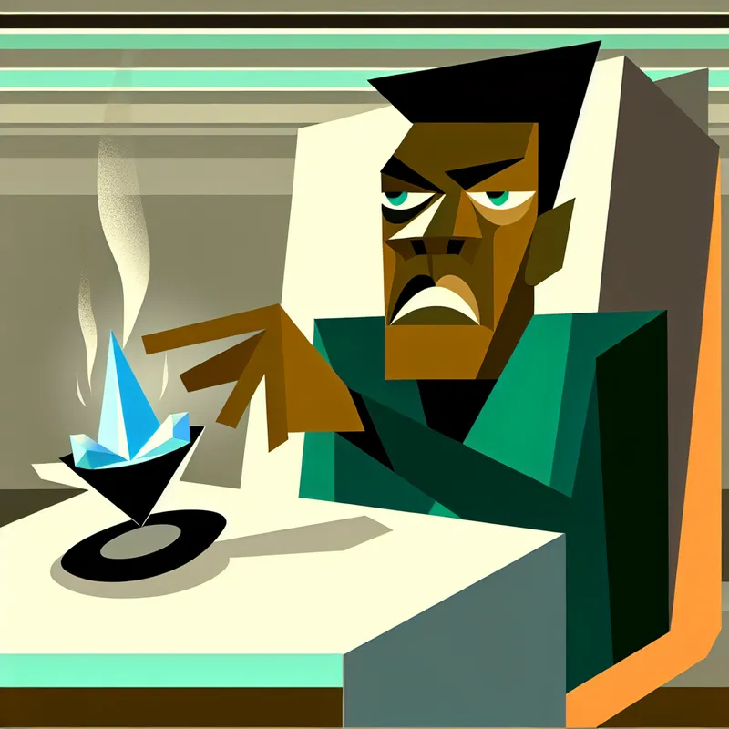 Persoon met een uitdrukking van afkeer duwt een kop koude koffie weg in een retro-futuristische setting