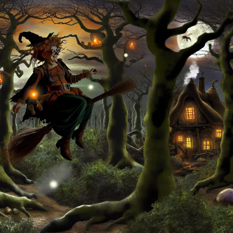 Heks met magische krachten vliegt op bezemsteel door betoverd bos in sprookjesachtige scène