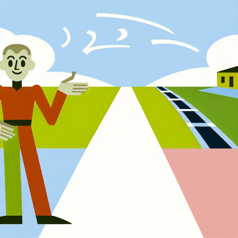 Minimalistische illustratie van een persoon die iemand uitnodigt om hierheen te komen, met een pad, trein en auto op de achtergrond