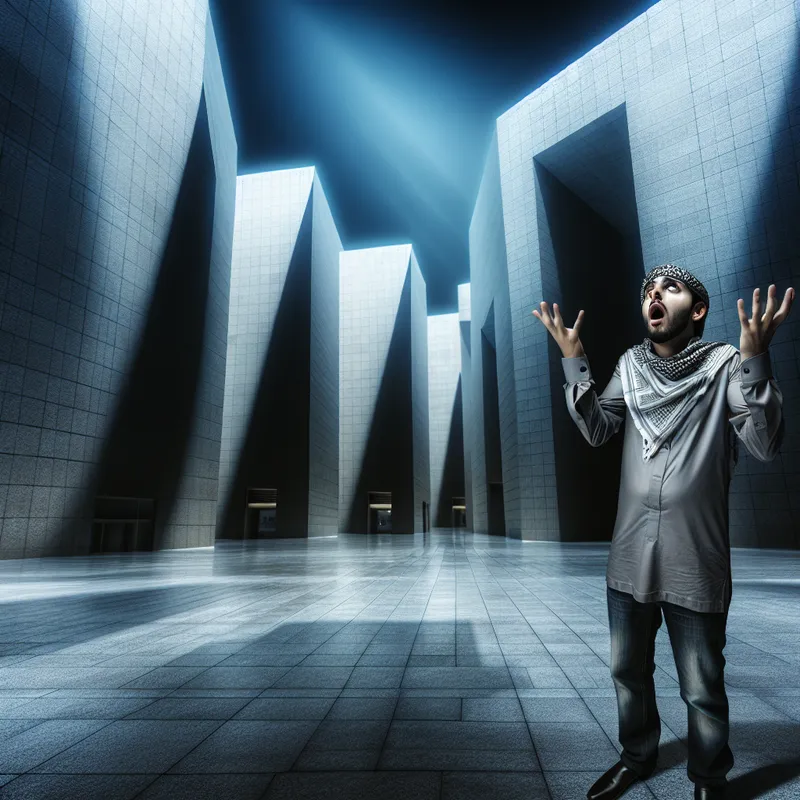 Persoon in surrealistische stad met verbazing en ongeloof reagerend op onverwacht nieuws, uitroepend 'Hoezo?'