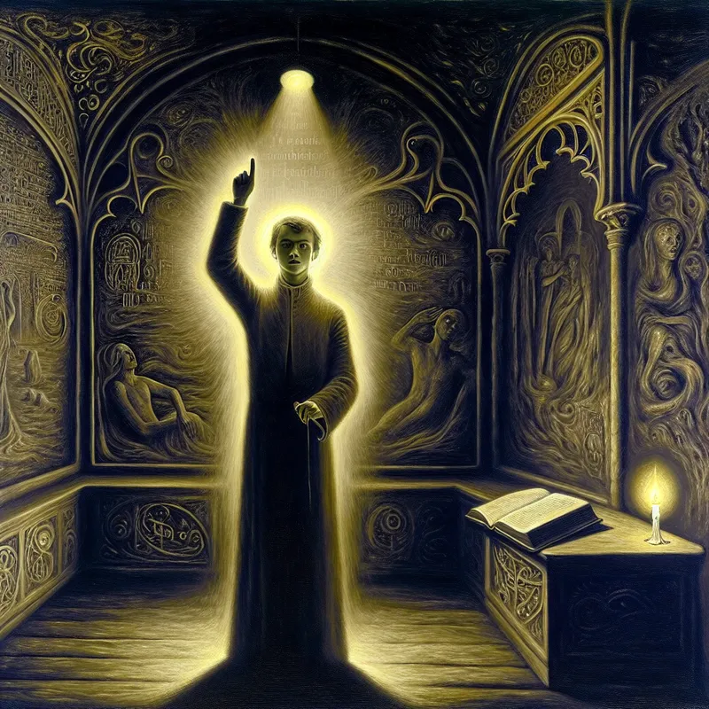 Persoon met overtuigde gebaar in donkere gotische ruimte, symbolisch voor bevestiging en zekerheid