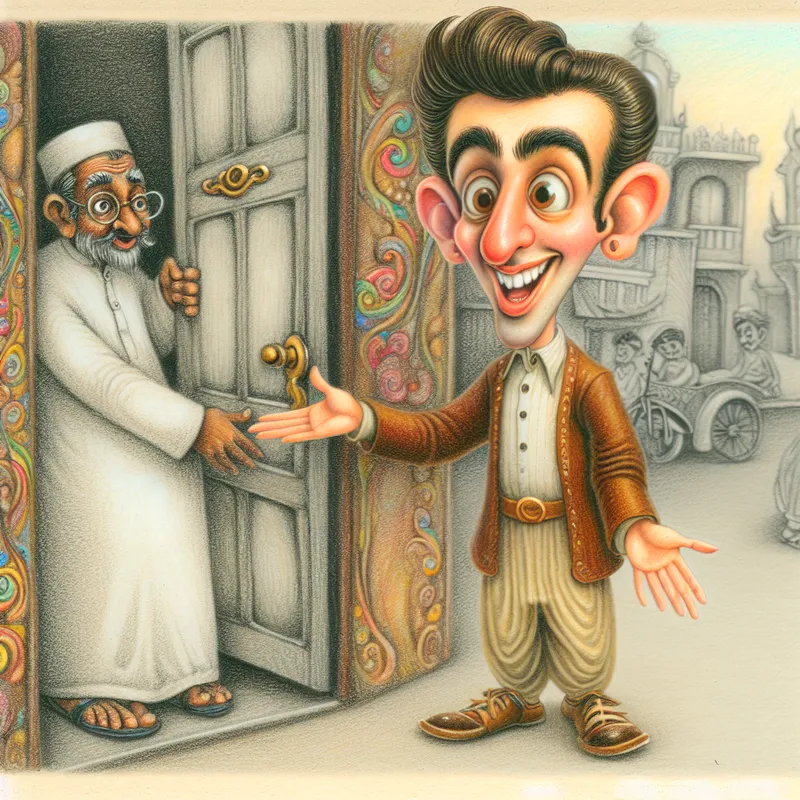 Vriendelijke jongeman houdt de deur open voor een oudere persoon in een charmante cartoonstijl