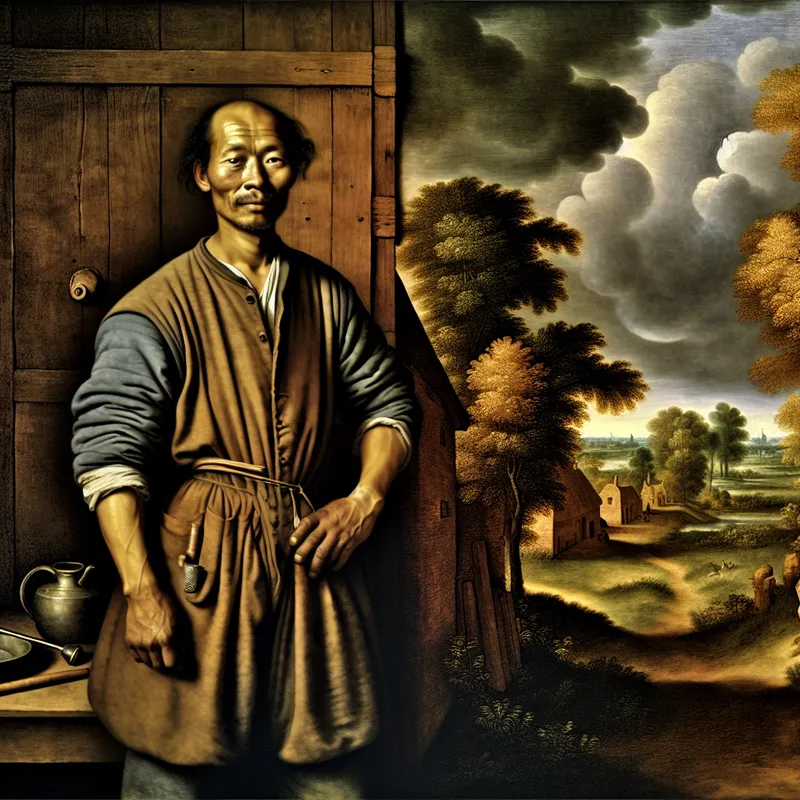 Een vertrouwde volwassen man met een ruige uitstraling staat voor een houten deur in een 17e-eeuws Nederlands landschap, geschilderd in de stijl van Jacob van Ruisdael