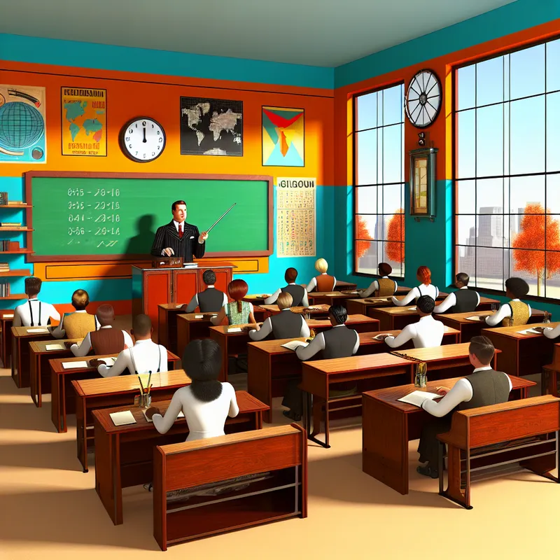 Retro-futuristische klaslokaal met lerares en aandachtige leerlingen tijdens een les, helder verlicht door grote ramen