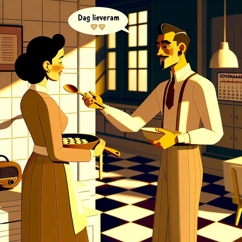Stel in retro-futuristische keuken, man fluistert 'Dag lieverd' tegen vrouw met houten lepel, sfeer van liefde en warmte