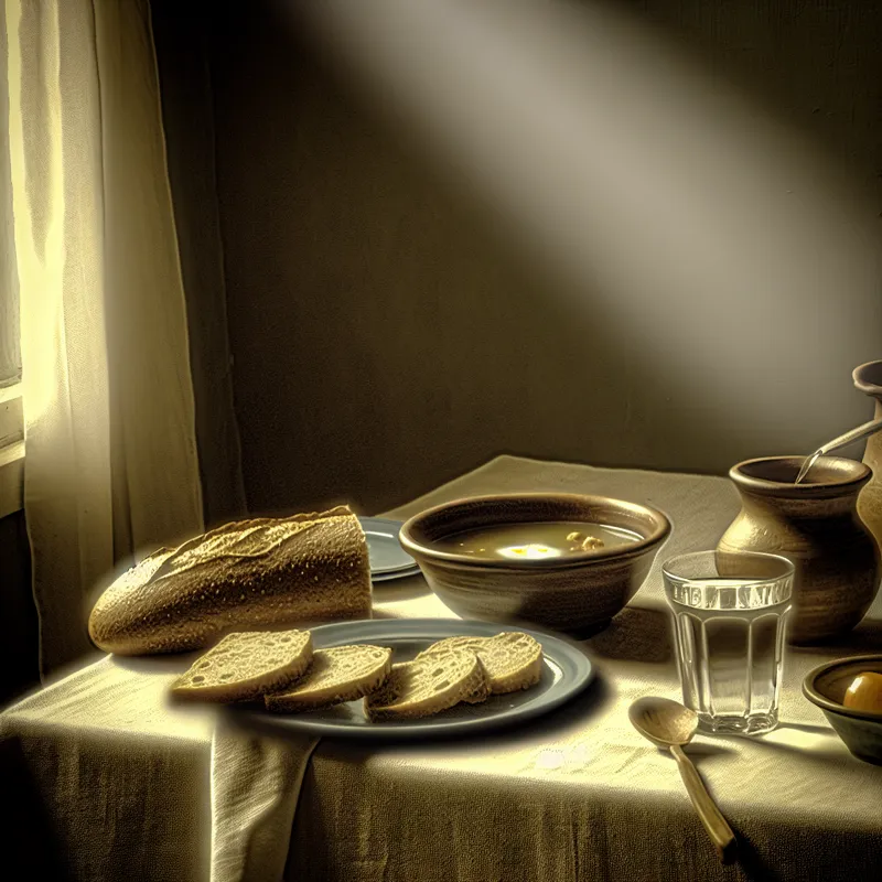Serene schilderij in Vermeer-stijl van een rustige lunch met vers brood, warme soep en een glas water op een tafel met zacht natuurlijk licht