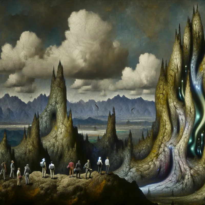 Surrealistisch landschap in de stijl van Hieronymus Bosch met imposante bergketen, mysterieuze hemel en kleine mensfiguren die eerbied tonen voor de grootsheid van de natuur