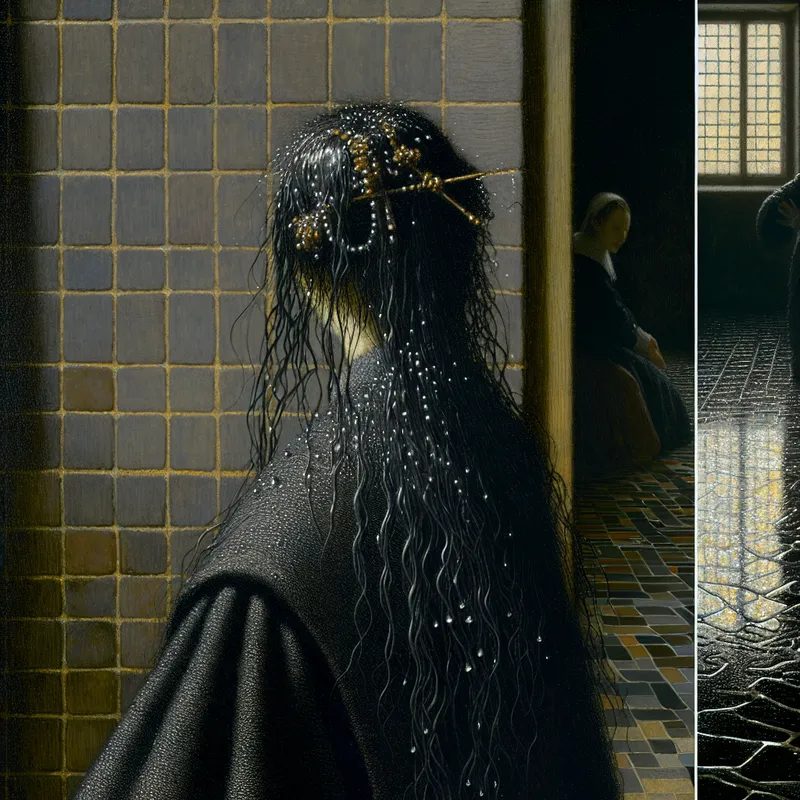Elegant schilderij van een persoon met nat haar en vochtige kleding bij een houten emmer in een intieme binnenruimte