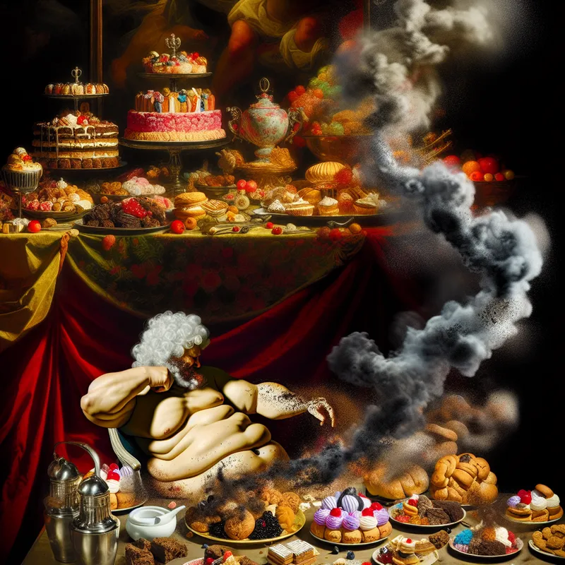Barokke allegorische voorstelling van gezondheid die terugdeinst voor schadelijke voeding en rook, met overvloed aan zoetigheden en sigarettenrook